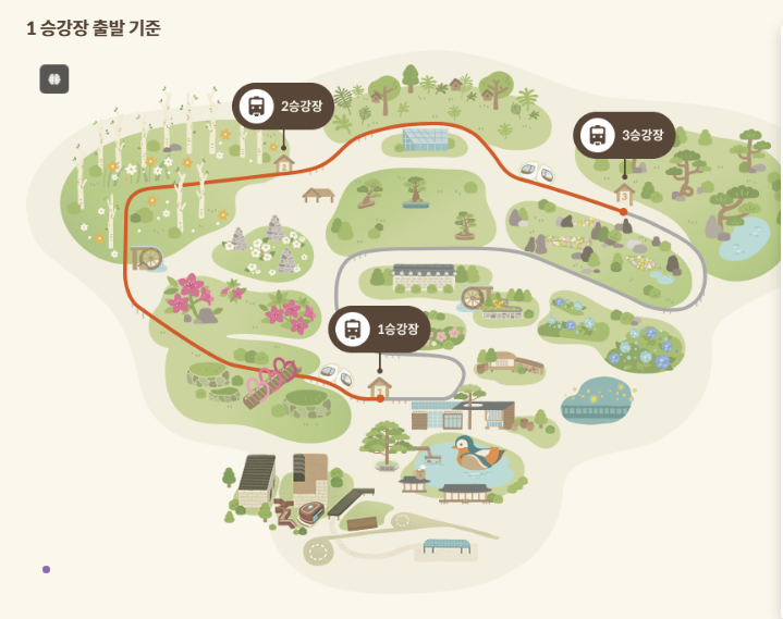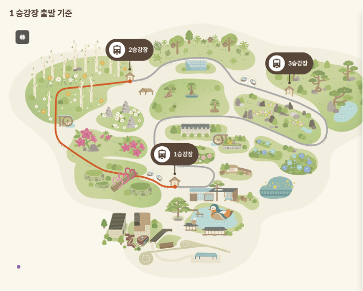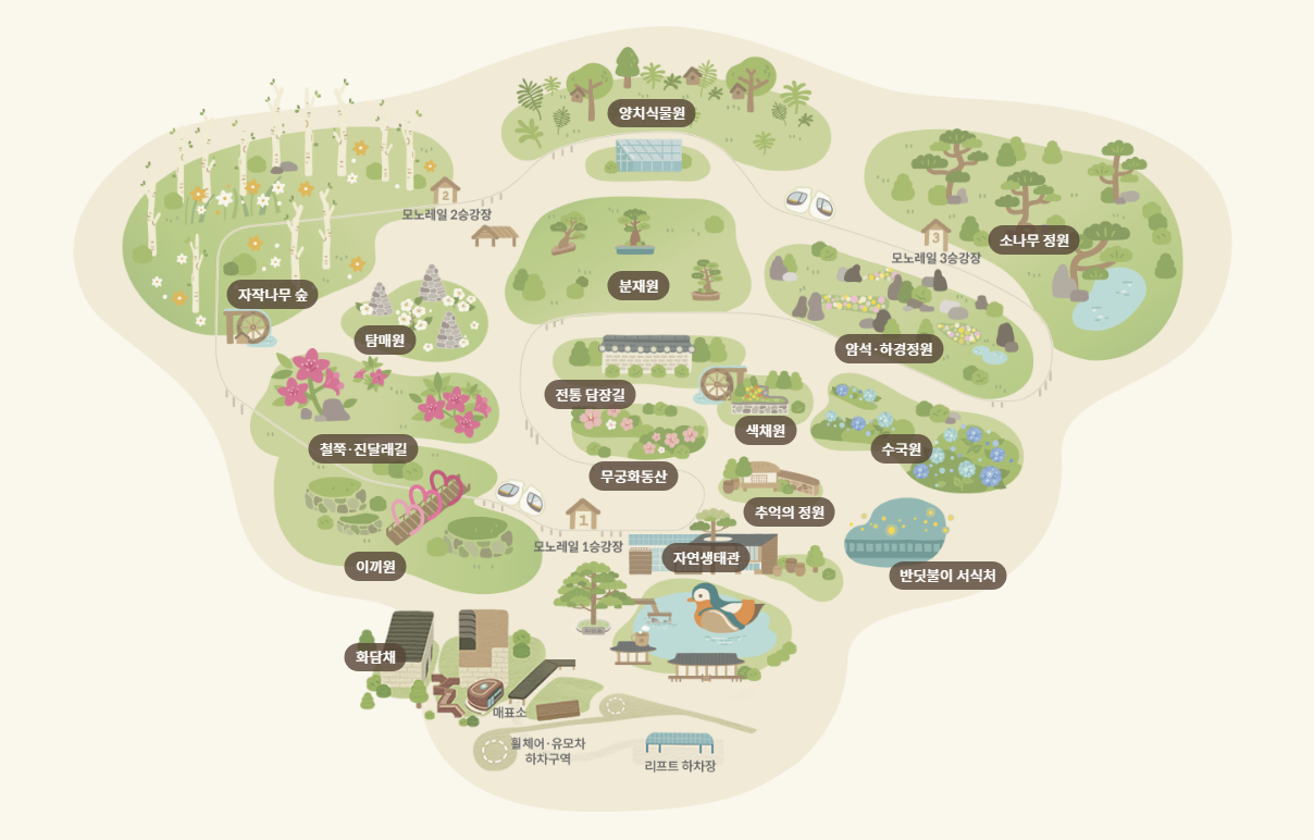 📌체력 소모를 줄이는 방법: 만약 유모차나 휠체어를 이용하거나 체력이 부족하다면, 경사가 있는 산책로 대신 모노레일을 이용하는 것이 좋습니다. 1구간에서 2구간까지는 경사가 있기 때문에, 이 구간을 모노레일로 이동하면 체력을 아낄 수 있습니다.