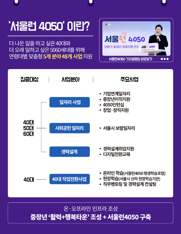 서울런 4050은 40대부터 64세까지의 중장년층을 대상으로, 안정적인 노후 준비와 재취업을 지원하는 서울시의 평생학습 프로그램으로, AI 발전과 조기퇴직으로 인한 중장년층의 고용 불안을 해결하기 위해 마련되었습니다.