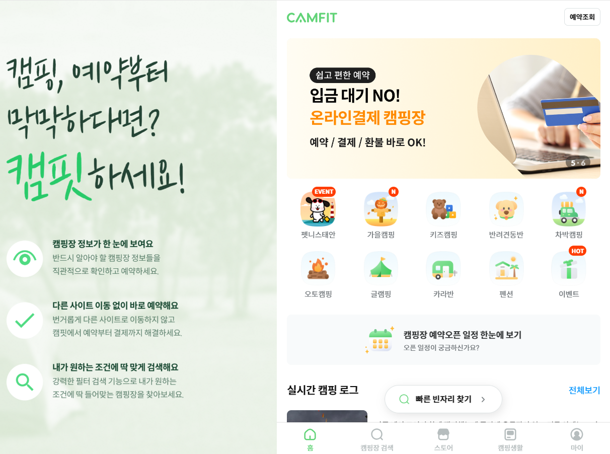 캠핏은 오토캠핑, 글램핑, 카라반뿐만 아니라 다양한 체험형 캠핑 옵션까지 제공하는 플랫폼입니다. 체험캠핑이나 테마캠핑을 원하는 가족 단위 이용자들에게 특히 인기가 높으며, 사용하기 쉬운 직관적인 예약 시스템 덕분에 초보 캠핑객에게도 적합합니다.