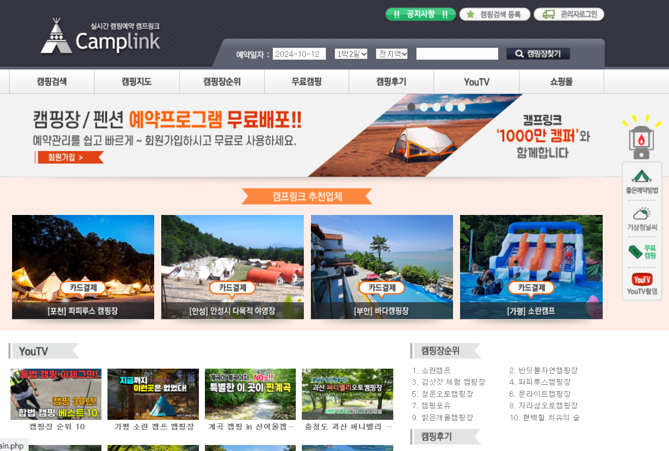 캠프링크는 캠핑장 랭킹과 리뷰를 제공하는 사이트로, 사용자들이 자신에게 맞는 최적의 캠핑장을 쉽게 찾을 수 있도록 도와줍니다. 특히 무료 캠핑 이벤트와 캠핑장 지도 검색 기능을 통해 다양한 정보를 얻을 수 있어 많은 캠핑 애호가들에게 인기를 끌고 있습니다.