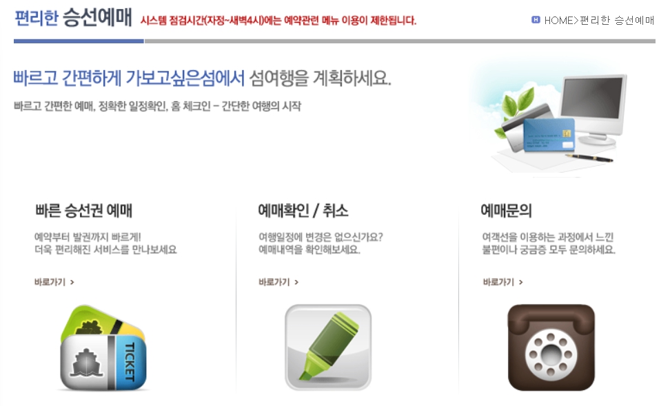 ☞''가보고 싶은 섬' 사이트 메인 화면 좌측상단 편리한 승선 예매로 들어가시면 날짜, 도착지와 출발지, 왕복 여부를 선택하여 여객선 탑승권을 구매할 수 있습니다.