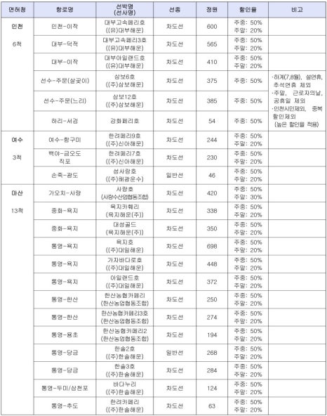 여객 운임료는 주중, 주중, 주말, 항로, 선박별로 할인율이 다르게 적용될 수 있으니, 자세한 사항은 아래에서 확인해 보시기 바랍니다.